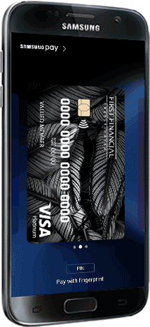 Get the great features, rewards and benefits of your First Financial Platinum Visa or Visa debit card with Samsung Pay.